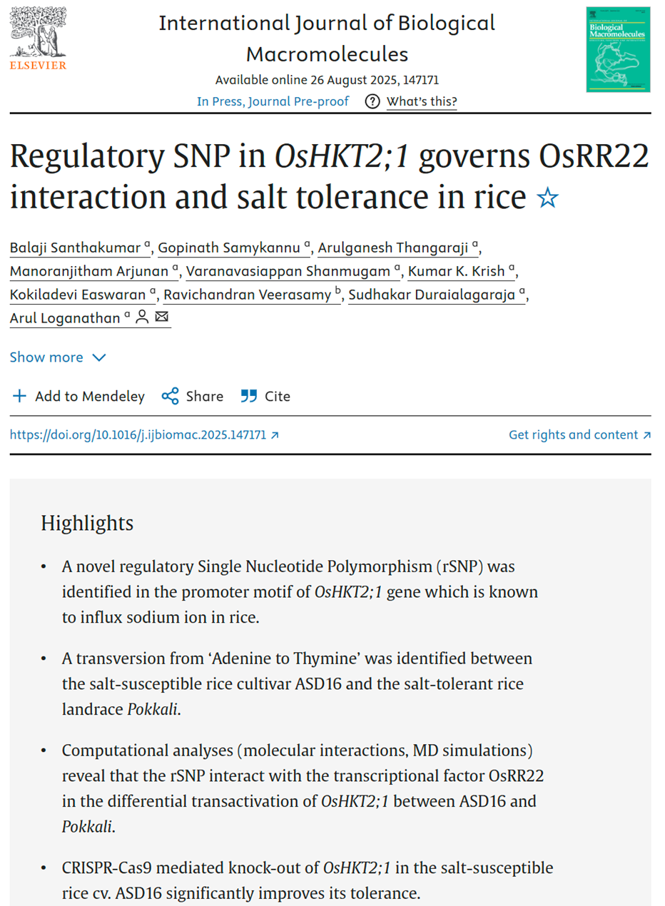 This prediction was later confirmed when Balaji Santhakumar published his findings. His paper, "Regulatory SNP in OsHKT2;1 governs OsRR22 interaction and salt tolerance in rice," validated thatOsHKT2;1 was indeed the gene he had identified through years of research. His work showed that a CRISPR-Cas9 knockout of this gene significantly improves salt tolerance in susceptible rice cultivars.