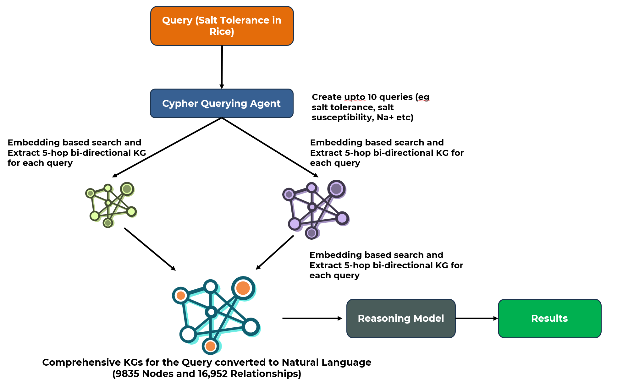 - Query Expansion: A "Cypher Querying Agent" generates up to 10 related sub-queries (e.g., "salt susceptibility," "Na+ toxicity").