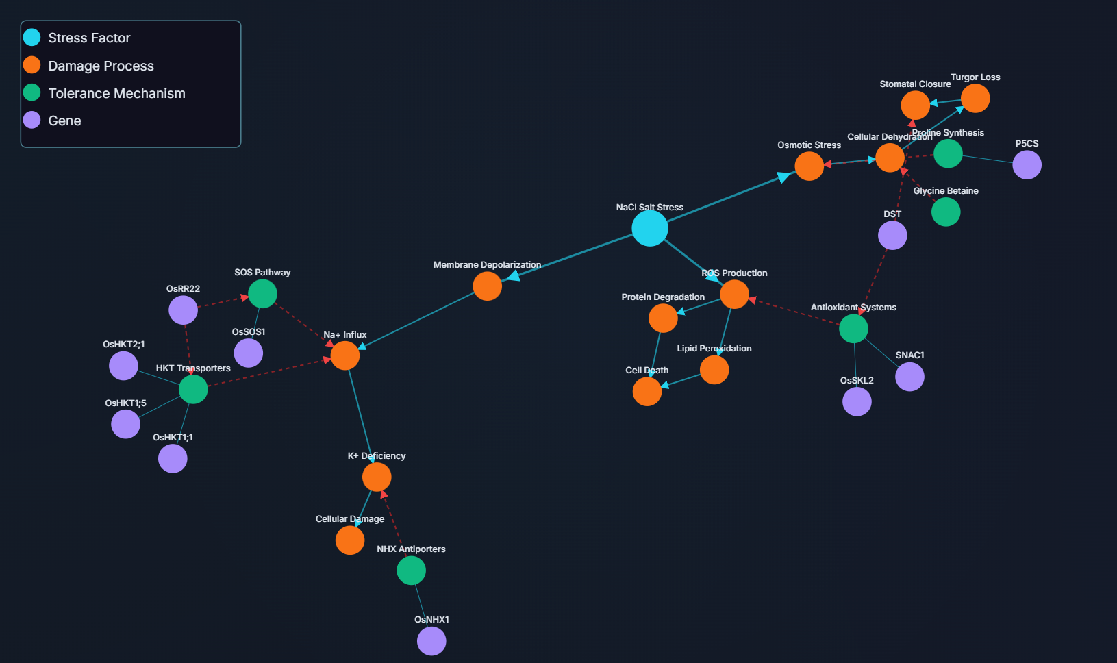 The Insight: A simple analysis might just suggest overexpressing OsHKT2;1 because it's an ion transporter. However, by connecting these four nodes, the KG revealed a much more nuanced picture. It inferred that the regulatory pathway involving OsRR22 is a key control point. Since a loss of OsRR22 function is beneficial, and OsRR22 regulates OsHKT2;1, it strongly suggests that down-regulating or knocking out OsHKT2;1 could be a viable strategy to enhance salt tolerance.